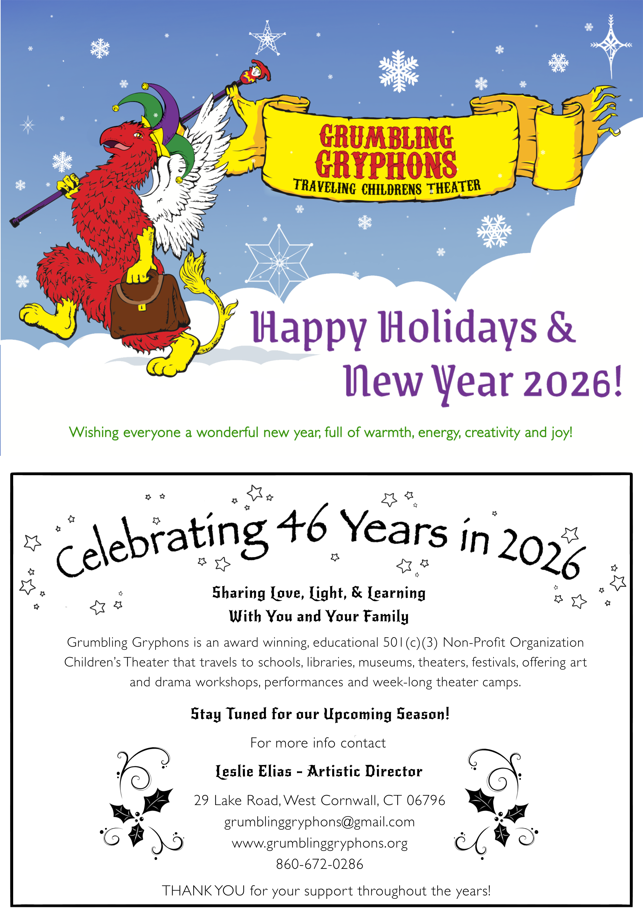 Grumbling Gryphons Traveling Children's Theater (winner of the 2003 Connecticut Governor’s Arts Award) was founded in 1980 and now embarks on 46 years of bringing quality performances and educational workshops to audiences throughout the world. Grumbling Gryphons is a 501(c)(3) nonprofit organization.